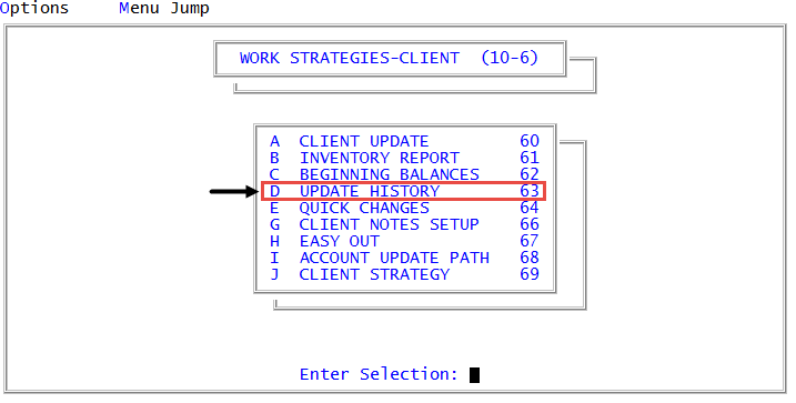 Management Strategy > Client > Update History (menu 10.6.63). - In the History Report Setup window, select Stair Step History Records, and press Enter or click Ok.