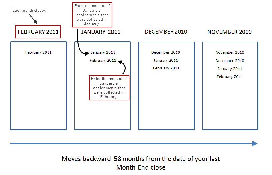 In the 2 MO field, type the amount of the named month's assignments that were collected in the month after assignment, and press Enter. In this example, you would enter the dollar amount of November's assignments that were collected in December.