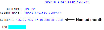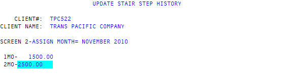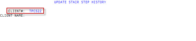 In the Client# field of the Update Stair Step History screen, type the code your agency uses to identify this client, and press Enter.