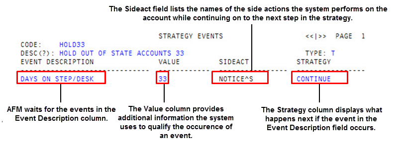 - Strategy – Indicates what action is executed if the event in the Event Description column occurs. When the cursor is in the Strategy column, the bottom of the screen displays the following three options: