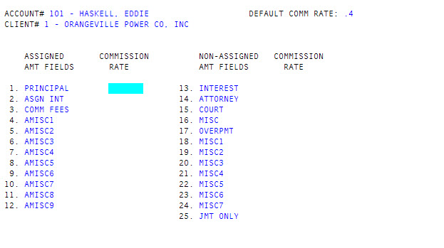 In the Commission Rate column of the Account Commission Update screen, for each amount field, type the commission rate or commission code associated with that amount, pressing Enter to move from one field to the next.