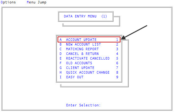 Data Entry > Account Update (menu 1.1). - If The Collector System is in a preliminary Month-End process, the Preliminary Month End in Progress. Use Old or New Month? prompt displays. Do one of the following: