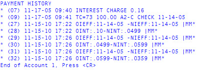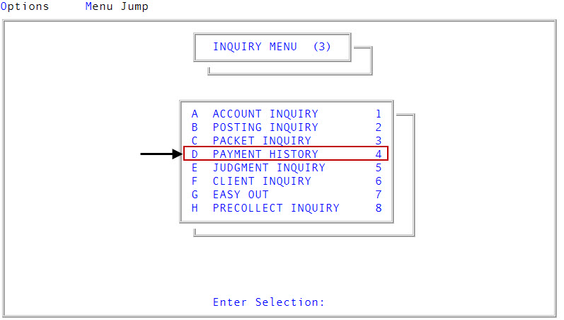 At the End of Account number, press <CR> prompt in the Payment History screen, press Enter to return to the Enter Account # window.