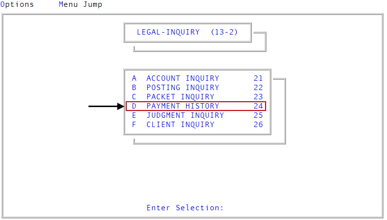 Legal > Inquiry > Payment History (menu 13.2.24). -