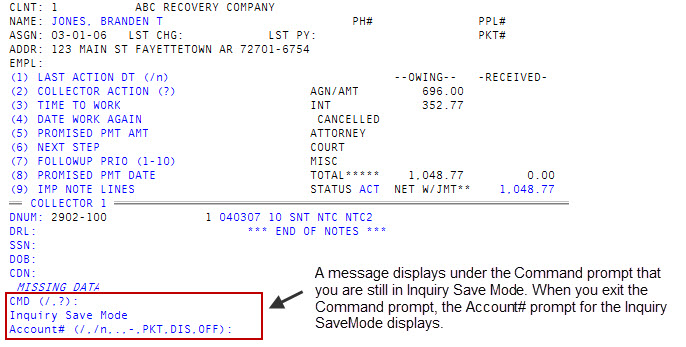 The account number you enter does not have to be included on your saved list. When you return to the Account# prompt after working the account, you are still in the Inquiry Save Mode, as shown in the following screen example. This is particularly useful if you have to interrupt your work on a saved list to work another account. You can work the other account and then return to the saved list.