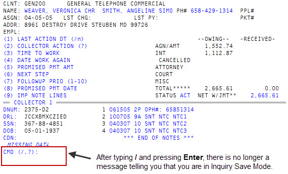 To leave the Inquiry Save Mode, type /, and press Enter.