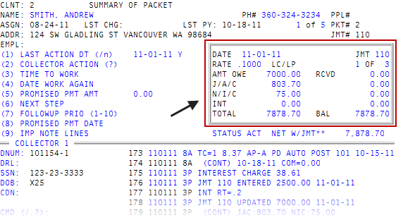 Use command WJ to view the details about a judgment such as the effective date, interest, and amount from the Judgment window. You can only view information in the Judgment window; you cannot update information.