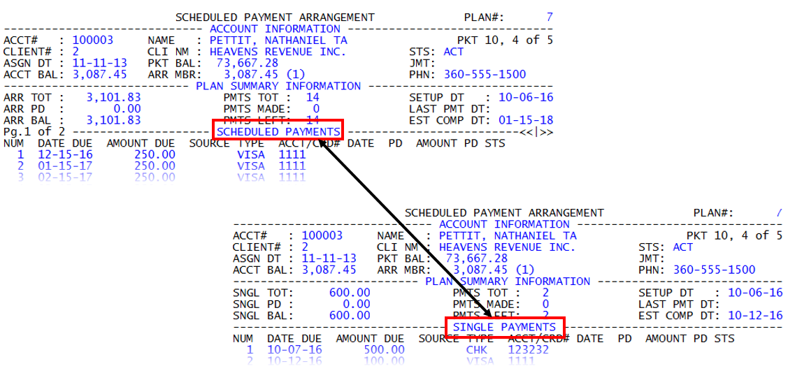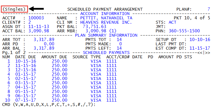 When the collector types command V again to switch back to the Scheduled Payments mode, the term "(singles)" now displays in the upper left corner of the screen to let any user who views the SPA for this customer that single payments have also been made, shown as follows: