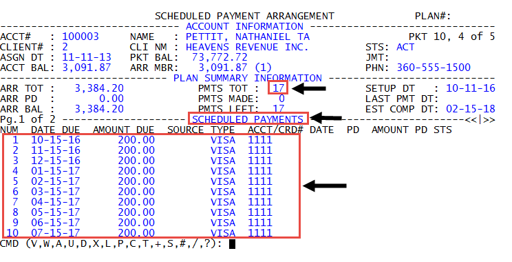 The commands listed in the CMD prompt vary depending on if packet members are included in the SPA or if you are in the Single Payments area of the Scheduled Payment Arrangement screen. For a list descriptions for the commands on this screen, see Scheduled Payment Arrangements (SPAs).