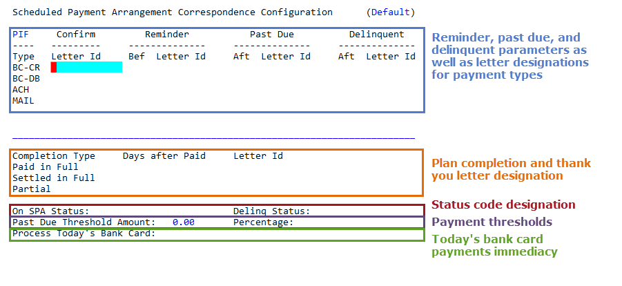 - To return to the Scheduled Payment Arrangement Correspondence Configuration screen, type /.