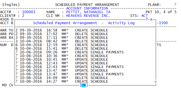 To view the SPA Activity Log for single payments, type V to toggle to the Single Payments area of the Scheduled Payment Arrangement screen, and press Enter.