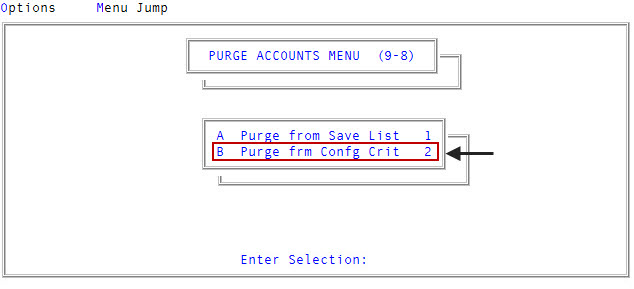 Utility > Purge Accounts > Purge frm Confg Crit (menu 9.8.2). - In the Purge Routines window, select Back Up Accounts to be Purged, and press Enter or click Ok.