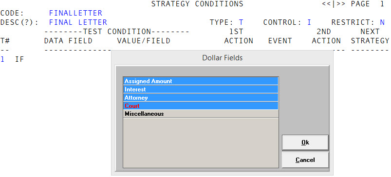 Windows—Dialog boxes that prompt you to select or enter specific information for a routine. Many windows in The Collector System allow you to enter a question mark to choose from a list of options. If this is the case, the window title will display a question mark in parenthesis. After you enter information in the window, you can press Enter or click Ok. For example, to go to the Collector screen, The Collector System displays a window prompting you to type the desk number of the accounts to view.