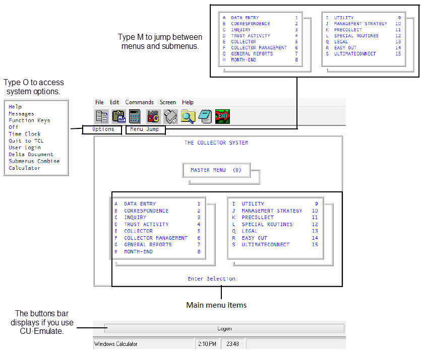 - Menus—The places in The Collector System where options and routines reside. For more information, see Using menus.