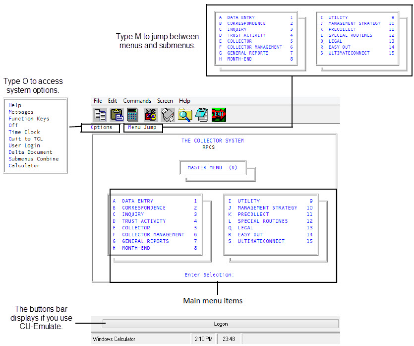 When you log in to The Collector System, the Master menu displays. From here, you can access menus or system options.