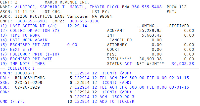 Screens—The areas of The Collector System where you perform routines and add/edit information, such as configuring system features and adding account information. Screens include multiple fields and prompts for completing the configuration of a feature or process. The following is an example of the Collector screen, which includes many different fields used to work an account. For more information, see Using screens.
