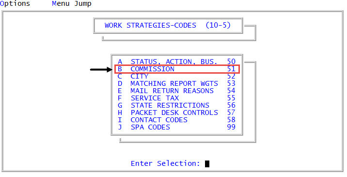 - To change the code, type U, and press Enter. The cursor moves to the top line of the Type column. Press Enter to move the cursor until you reach the field to change. Lines can be added to the bottom, but cannot be inserted between existing lines. For more information on each field to changes, see Creating standard commission codes.
