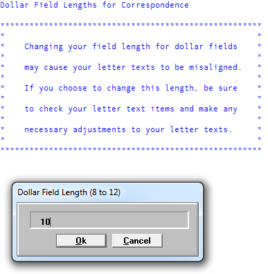 - In the Letters/Notices Setup window, select Change Dollar Field Lengths, and press Enter or click Ok.