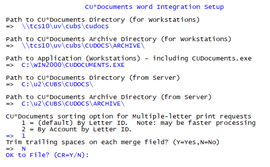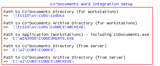 - In the CU·Documents Word Integration Setup screen, under the Path to CU*Documents Directory (for Workstations), type, or change, the path to the workstation root directory, and press Enter.