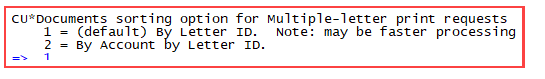 - At the CU*Documents sorting option for Multiple-letter print requests prompt, do one of the following: