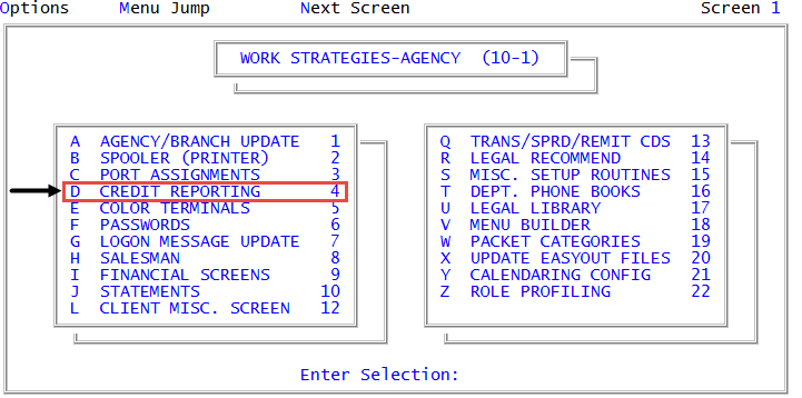 Management Strategy > Agency > Credit Reporting (menu 10.1.4). - In the Credit Reporting Setup window, select Credit Delay Table, and press Enter or click Ok.