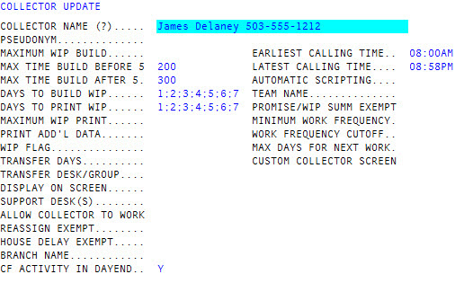 This entry does not restrict any functions, but displays a warning message if an account is brought up on the Collector screen before this time. To have no message display, as for support desks, leave the field blank.