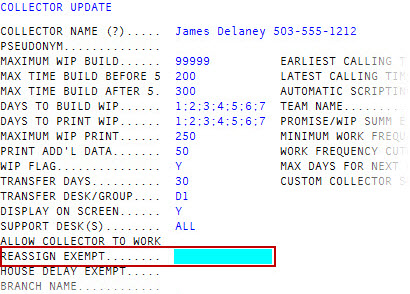 To not allow a collector to work accounts on the support desk, type N or leave the field empty (<NULL>), and then press Enter.