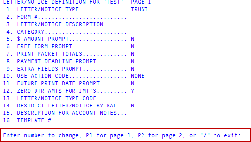 - To exit the letter/notice definition screen, at the Enter number to change prompt, type /, and press Enter.