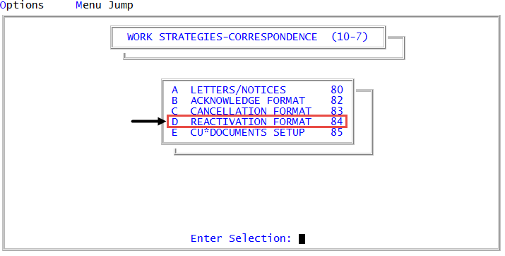 Management Strategy > Correspondence > Reactivation Format (menu 10.7.84). - In the Reactivation Format window, do one of the following, and press Enter or click Ok.