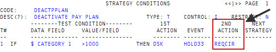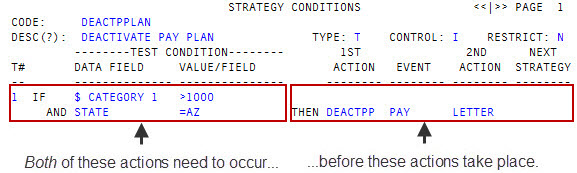 11. Before entering the strategy action in the 1st Action field, to add another test condition that the account must meet before the action is applied by the system, press Enter until the cursor moves to the Data Field field of the next line. Repeat Steps 9-11 until you add all of the AND conditions.