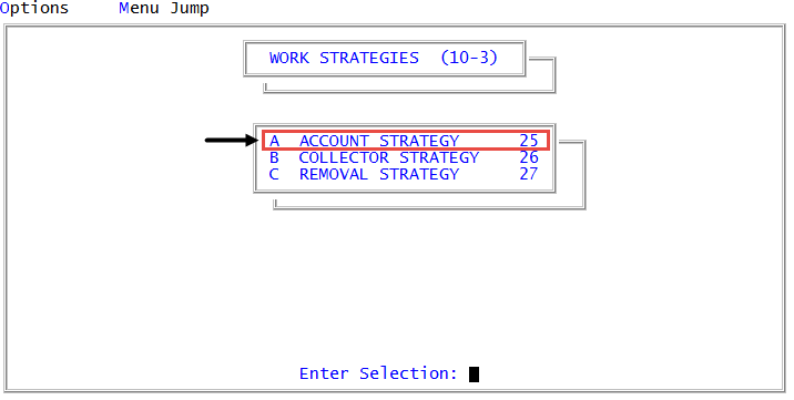 1. From the Master menu, navigate to ClosedManagement Strategy > Work Strategies > Account Strategy (menu 10.3.25).