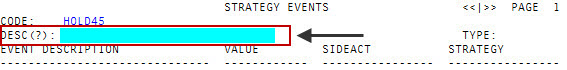 The Code field of the Strategy Events screen displays the name you typed in the Event Strategy Event ID window. This field cannot be edited in this screen.
