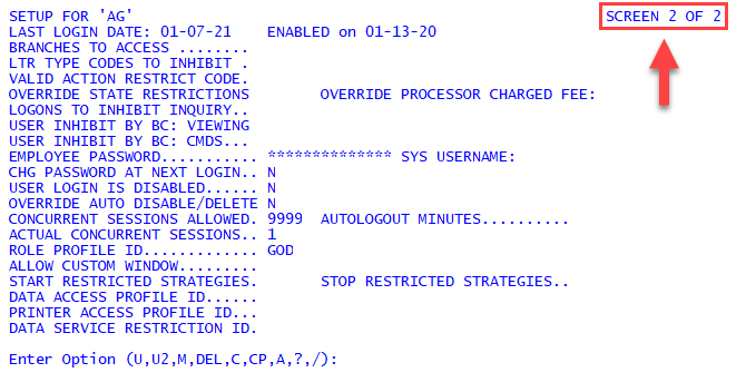 - At the User Login screen prompt at the bottom of the page, press Enter or type U2 to continue to the next page of fields.