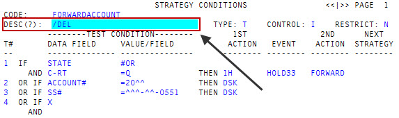 In the Desc (?) field of the Strategy Conditions screen, type /DEL, and press Enter.