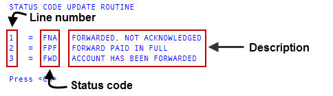 When you request to view a list of status codes, the listing includes the status code along with its line number and description. You need to reference the line number when inserting, changing, or deleting status codes.