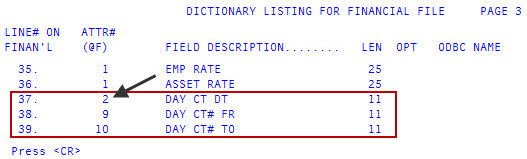 Write down the field attribute numbers listed in the ATTR# column. You will need these numbers when creating Day-End counters.