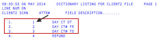 Write down the field attribute numbers listed in the ATTR# column. You will need these numbers when creating Day-End counters.