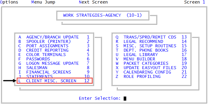 Management Strategy > Agency > Client Misc Screen (menu 10.1.12). - In the Client Misc Screen Update window, select Print Dictionary Only, and press Enter or click Ok.