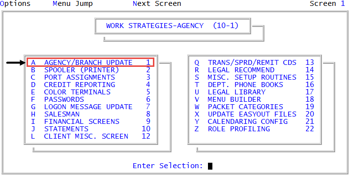 Management Strategy > Agency > Agency/Branch Update (menu 10.1.1).
