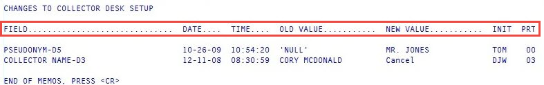 Displays the specific field that changed along with the date, time, previous value, new value, initials of the person who made the change, and port number.