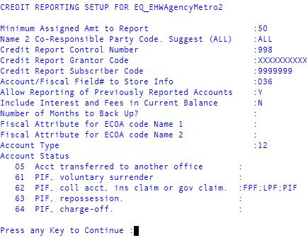 In the Credit Reporting Setup for Credit_Bureau_Name screen, press any key to view the rest of the report.