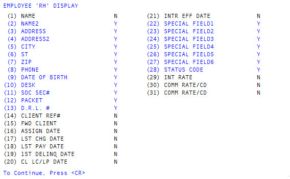 - Type Y, or leave blank, each field you are allowing this employee to access.