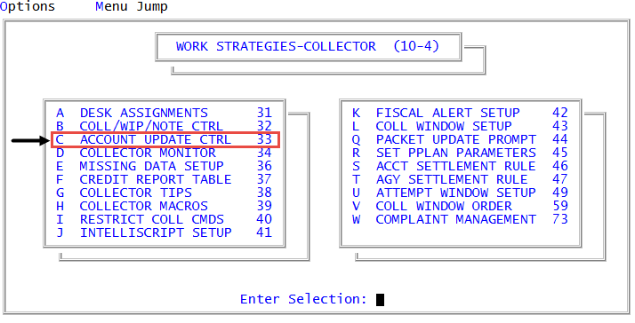 Management Strategy > Collector > Account Update Ctrl (menu 10.4.33). - In the Account Update Controls Options window, select Updates by Employee Initials, and press Enter or click Ok.