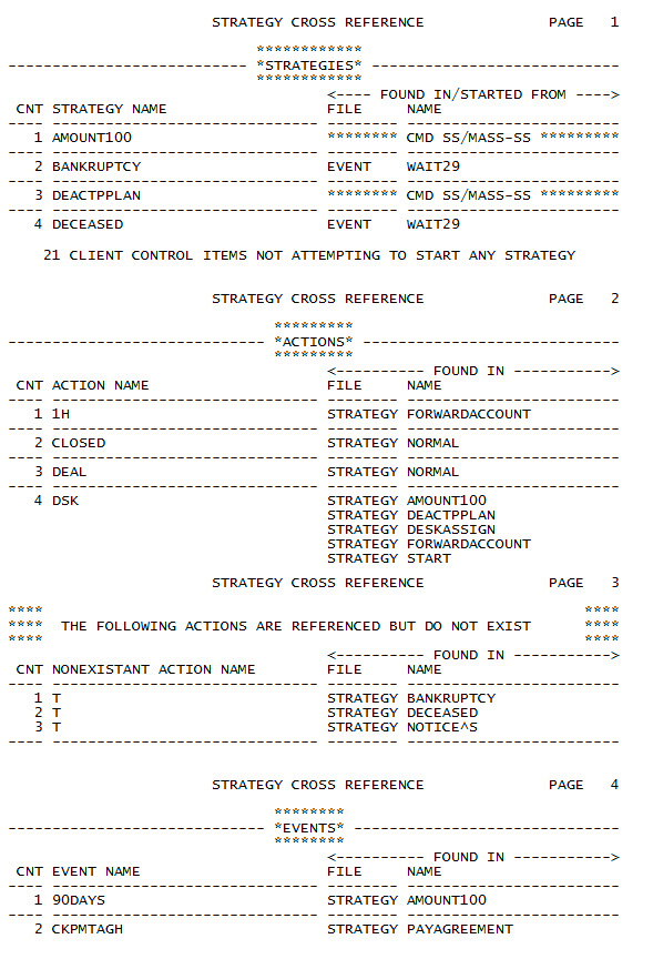 The Strategy Cross Reference report shows which strategies reference each action set, event set, and other strategies. The report also shows how each strategy starts. Any strategies, action sets, or event sets that are referenced but do not exist are flagged as well as any action or event sets that exist but are not referenced.