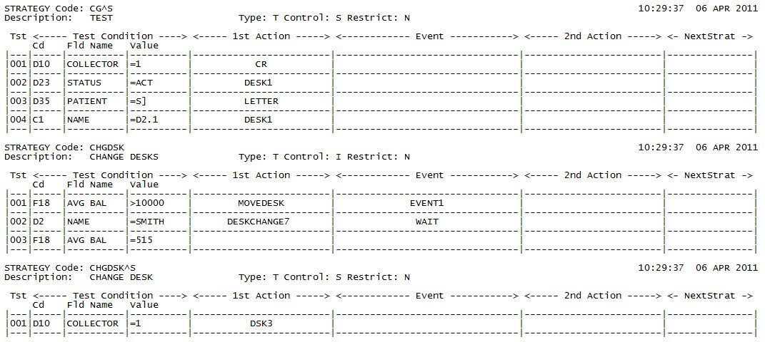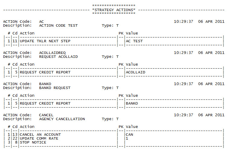 The Strategy report allows you to view a display of how all the parts of a strategy work together. It shows the relationship between the conditions, actions, and events of your strategies. You can run the report for a single strategy or for all of the strategies in your system. The report is useful for building, troubleshooting, and maintaining strategies.