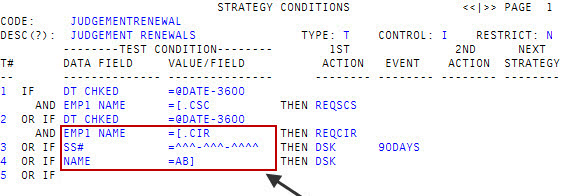 Refer to the following example of wildcard characters entered on the Strategy Conditions screen: