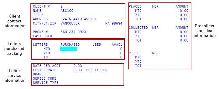 - The Placed, Collected, and P.I.F. information on the right-hand side of the screen is statistical information. You can access these fields only when you are setting up a precollect client record for the first time. After you save the record, only the system updates these fields.