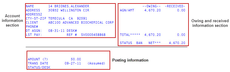 The Precollect Posting screen displays a variety of fields, only some of which you use when posting payments. The fields are grouped into three areas: account contact information, owing and received, and posting details. The fields above the line either cannot be edited directly in the Precollect Posting screen or the system updates them automatically.