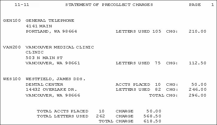 This item shows the total number of accounts placed with the agency by all clients and the corresponding charges for the statement period. This is printed at the bottom of the statement. |