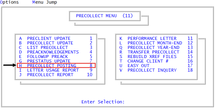- To return to the Precollect Posting screen to continue making changes, type /, and press Enter.